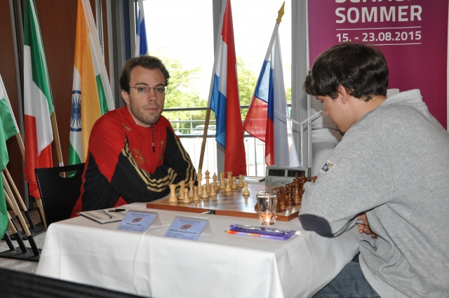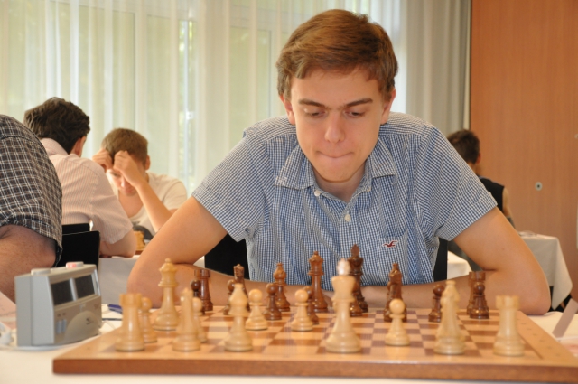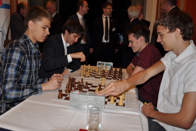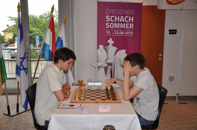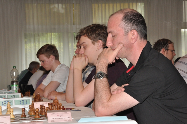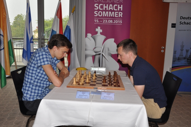 Ebenfalls in dieser Gruppe gelang es GM Evgeny Vorobiov (2575), den an 14 gesetzten Maximilian Neef zu besiegen und auch in der Partie des sogar an 2 gesetzten GM Victor Mikhalevski gegen Hans Möhn setzte sich ebenfalls der Großmeister durch. Hingegen vereinbarte GM Sergey Grigoriants (2606) mit Weiß am Spitzenbrett in einem Nimzo-Inder gegen Roven Vogel (2420) nach 19 Zügen Remis, man weiß ja nie bei diesen jungen Leuten, wird er sich gesagt haben.