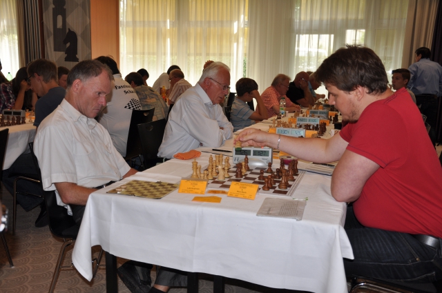 Nach allem Blitz und Donner saß heute wieder jeder am Brett. In der Gruppe A haben die Besten 3,5 Punkte aus vier Partien, ein halber Punkt hat sich also von jedem verabschiedet. Am Spitzenbrett spielt heute Sergey Grigoriants gegen Jens-Uwe Maiwald. Die Tabelle wird jedoch von Jonas Lampert, HSK Hamburg, angeführt, die Feinwertung macht's möglich. Schön ist, dass von den nicht gerade reisefreudig bekannten Bremern nicht nur drei in Dresden sind, sondern dass sie auch recht weit vorne agieren, also Thorben Koop, Olaf Pienski, aus dem Hintergrund (aus dem bekanntlich Rahn schießen müsste) von Frank Peters abgeschirmt. Anders als die Norddeutschen haben sich die von uns immer gern beobachteten Ungarn GM Iván Faragó (2,5 pt., 37.Rang) und WGM Petra Papp (2,0 / 49.) getarnt: Sie tauchen gerade in der Masse ab ... aber die tauchen auch wieder auf!