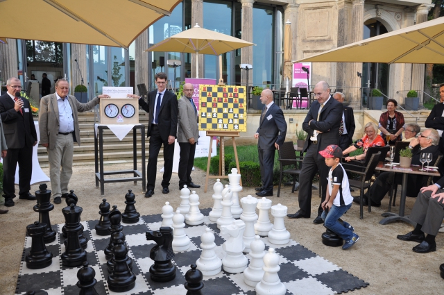 Bei bestem Wetter begrüßte Dr. Dirk Jordan etwa 130 geladene Gäste auf dem Lingnerschloss, darunter die auf Einladung der Pegasus GmbH zum wiederholten Male in Dresden weilenden „Schachlegenden“.