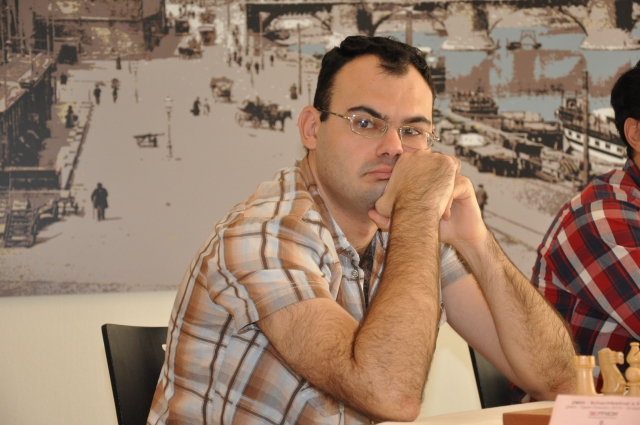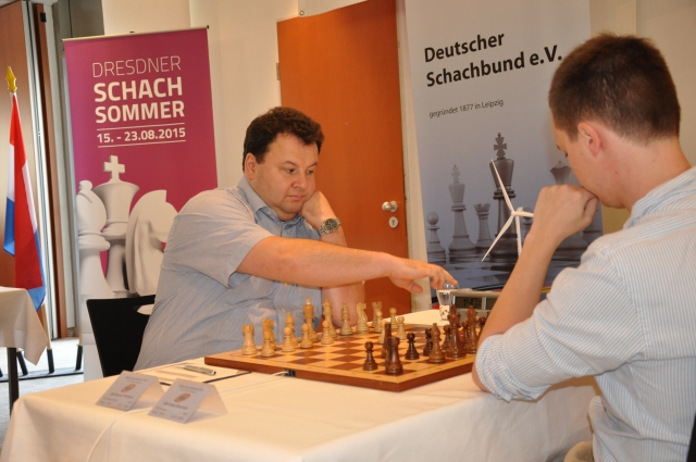 In der Partie Grigoriants – Mikhalewski begann es am ersten Brett des A-Open scheinbar gemächlich, aber nach 1.c4 e5 2.g3 Nf6 3.Bg2 Nc6 4.Nc3 Bc5 5.Nf3 d6 6.O-O O-O 7.e3 Bb6 8.Qc2 Ne7 9.d4 Ng6 10.Rd1 Qe7 11.b3 Re8 12.Ba3 exd4 * war es alles andere als gemütlich. Schon bei 8.Qc2 zuckte die Enzy-14 mit den Schultern und sagt, "tja, weiß ich jetzt auch nicht so richtig ... hatten wir so noch nicht hier." Normal ist wohl 8.b3 (Serper, Uhlmann uvam.). Gleich achteran, bei Vorobiov gegen Vladimir Zakhartsov, erlebte das Publikum etwas weniger, nämlich einen Abtausch-Slawen. Achtzehn Züge und schon war's remis. - Interessanter war's in GM Viacheslav Zakhartsov (2552) gegen Filiz Osmanodja (2302). Großmeister Viacheslav Zakhartsov ist der Vater von Vladimir und wurde hier im ZMDI Open 2014, also direkt im vergangenen Jahr, geteilter 1.-4. Manchmal kommt es natürlich auch vor, dass Vater & Sohn am Brett aufeinander treffen; in Split 2013 zum Beispiel ging's remis aus. Garantien dafür, dass das immer so sein wird, waren nicht zu haben. Aber gehen wir getrost davon aus: Weniger als die Platzierung vom vergangenen Jahr hat Viacheslav Zakhartsov auch diesmal bei uns nicht geplant. Das schien die an 30 gesetzte Nationalspielerin Filiz Osmanidja für sich aber ganz ähnlich zu sehen! In einer auf den ahnungslosen Amateur annähernd ausgeglichen wirkender Stellung opferte die Dresdnerin plötzlich im 21.Zug eine schwarze Qualität – hey, das brachte noch mehr Fahrt in die Sache! Um Zug 34 herum wurde die Bedenkzeit der Sächsin knapp, aber es gibt ja die Zusatz-Sekunden. Irgendwann verebbte die Initiative und der "mit der Startnummer Vier!" (D.T. Heck, Hitparade) spielende Großmeister sammelte das Endspiel ein.